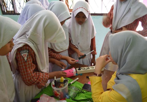 Edukasi pemilahan sampah dan praktik pengolahan sampah botol plastik menjadi barang yang berguna bersama SD 1 Ngampel kulon